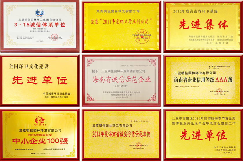 2017年2月1日,分別被三亞市園林環(huán)衛(wèi)局、吉陽區(qū)環(huán)衛(wèi)所、天涯區(qū)城管局、海棠區(qū)城管局及三亞市愛衛(wèi)辦等主管部門評定為“環(huán)境衛(wèi)生先進外包企業(yè)”